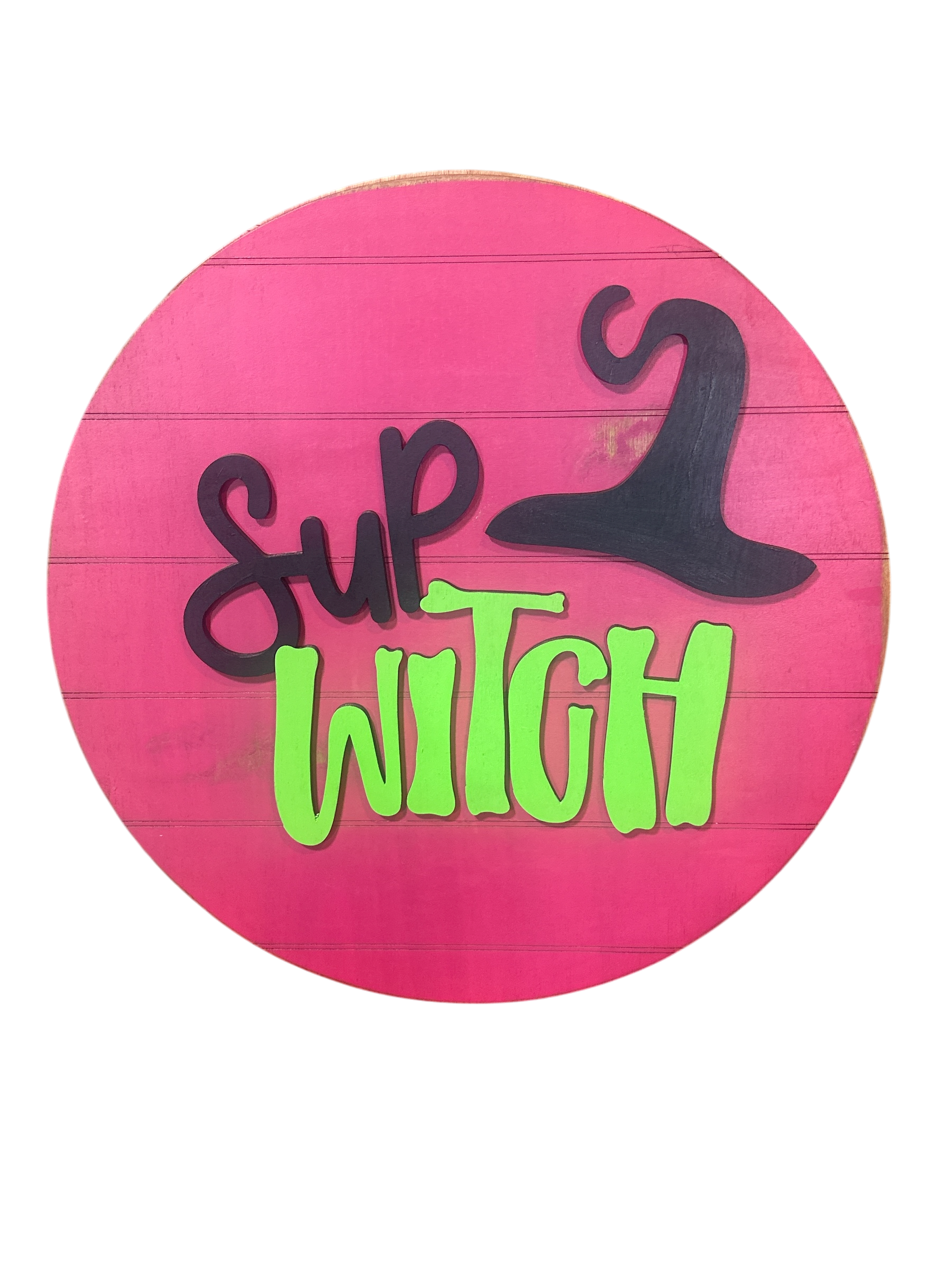 Welcome your favorite little monsters in style with this handmade 11”x48” “Welcome Monsters” porch leaner! Pair it with one or both of our 14-inch wood round door hangers featuring the fun Halloween sayings “Sup Witch” and “Hey Boo.”